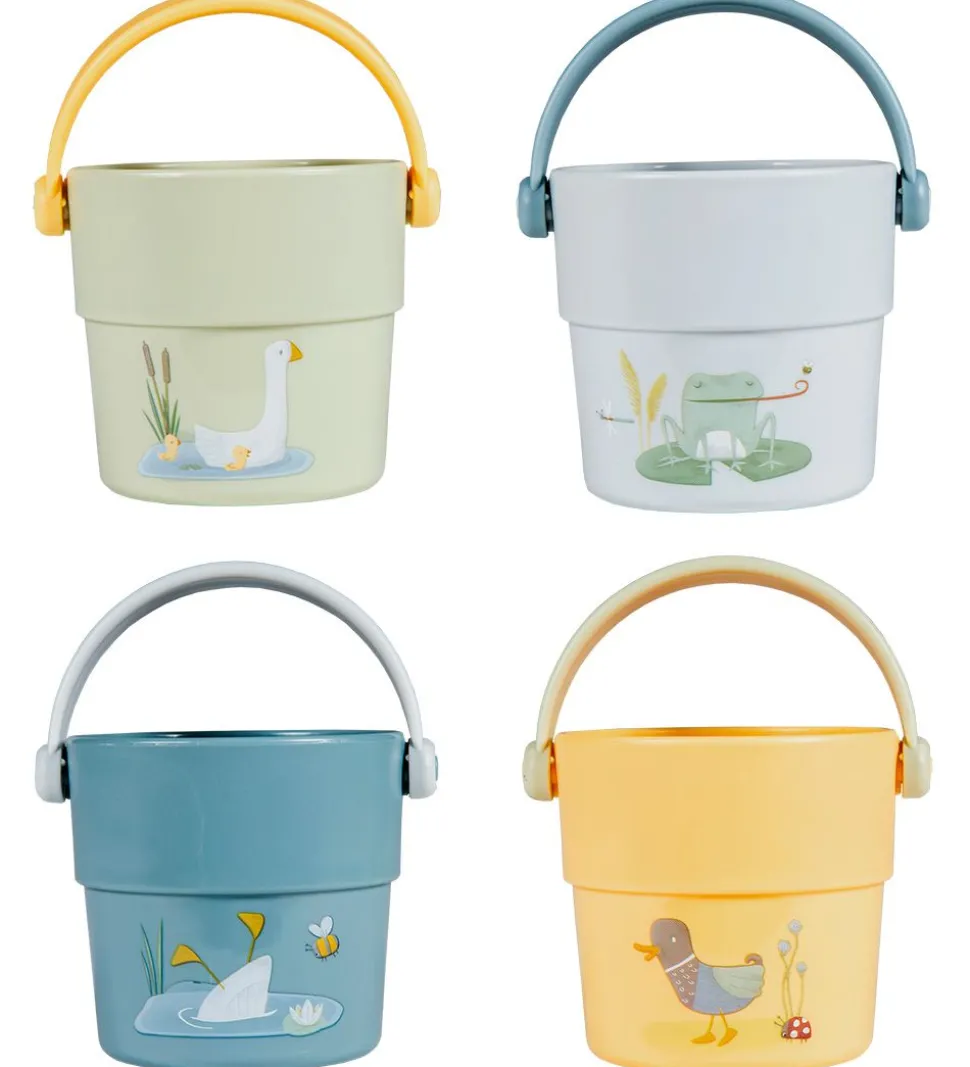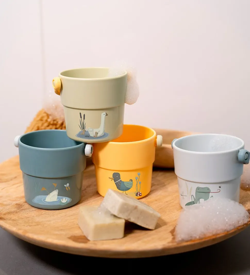 Skønne Little Dutch badelegetøj bestående af 4 spande i støvet grøn, støvet gul, navy og gul. På spandene er der søde prints af dyr samt tallene fra 1-4.