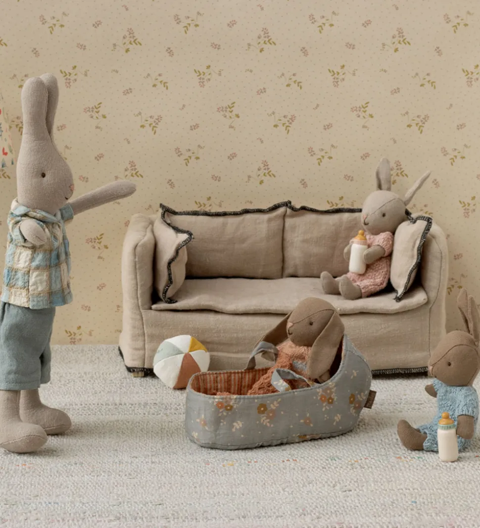 Maileg babyliften passer til Mailegs legetøj i størrelse mikro og gør familielegen komplet. Der medfølger en dejlig pude og et strikket tæppe, som baby kan ligge med.