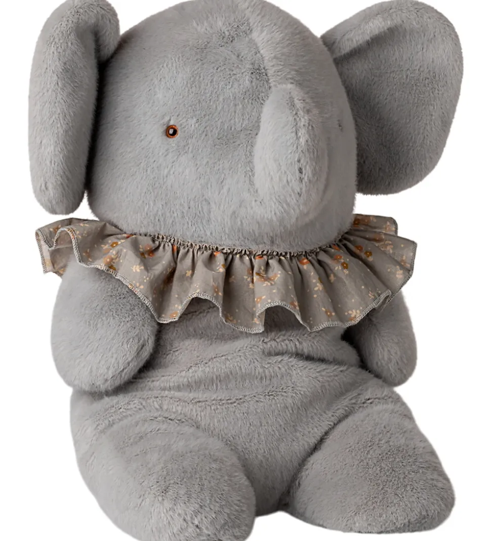 Charmerende Maileg bamse med form som en elefant i blødt, gråblå plys. Bamsen har en fin krave med blomsterprint omkring halsen. Maileg bamsen udstråler tryghed og er en sød tilføjelse til børneværelset.