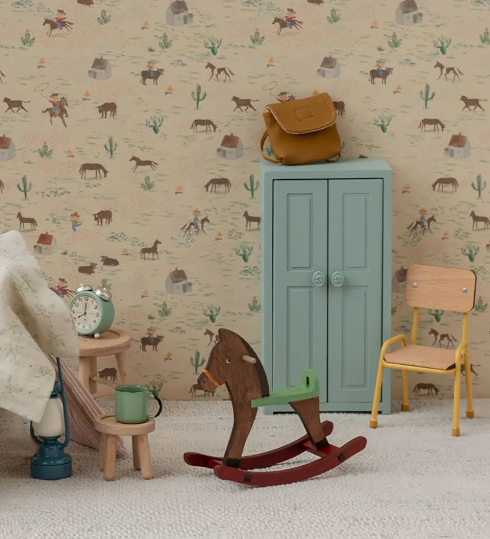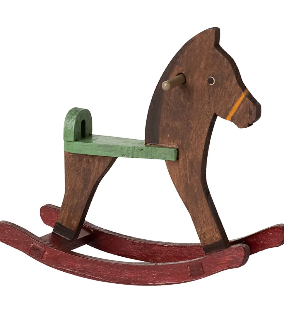 Charmerende Maileg gyngehest i brun, grøn og rød med fine detaljer. Gyngehesten af lavet i træ. Maileg gyngehesten passer til Mailegs mus.