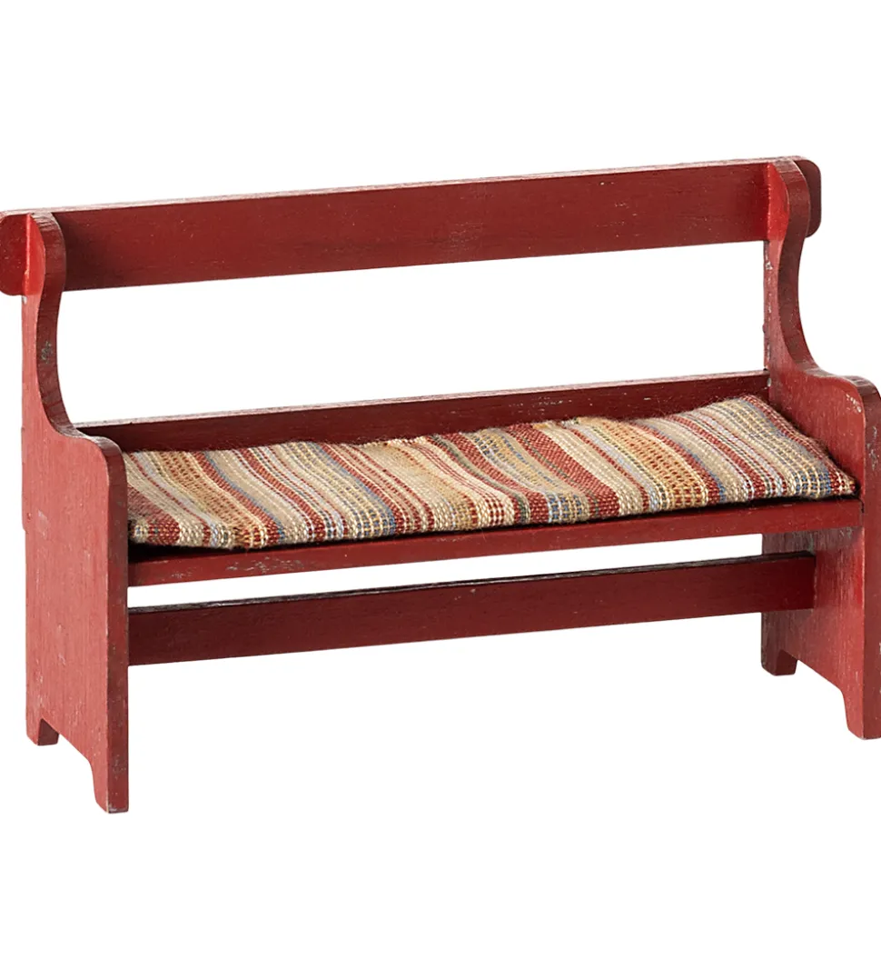 Fin Maileg træbænk med en dyb rød ramme og en farverig stribet hynde.