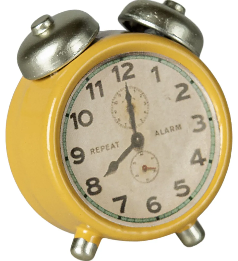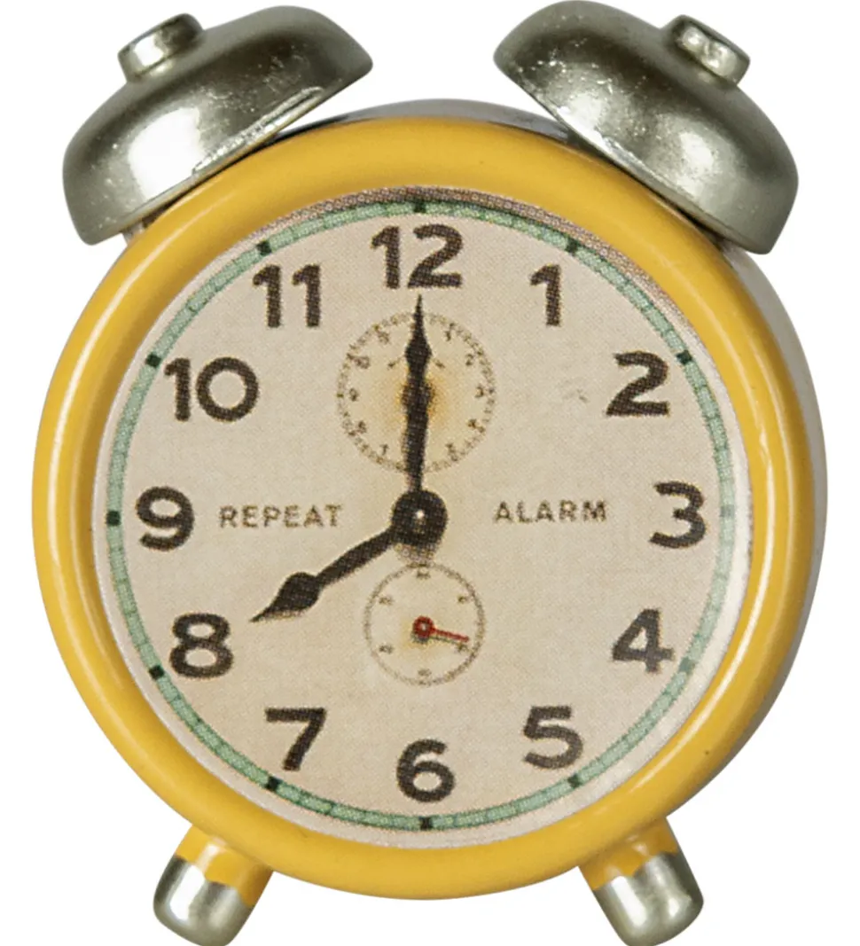 Fint Maileg vækkeur i et gult farvetema. Vækkeuret er i metal.