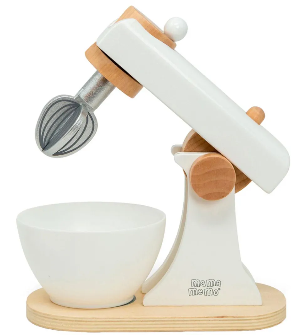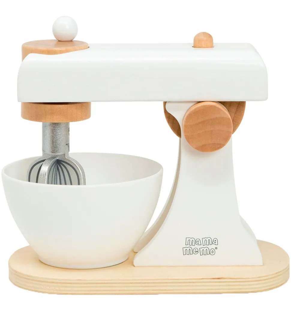 MaMaMeMo røremaskinen ligner den ægte vare og på toppen kan man dreje et hjul, som roterer mixeren i bunden. Røremaskinen kan åbnes, for at sætte skålen ind og skifte tilbehøret.