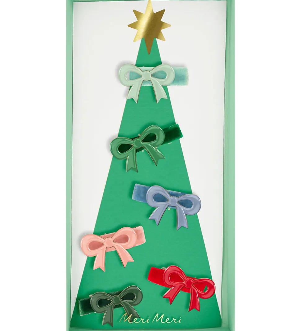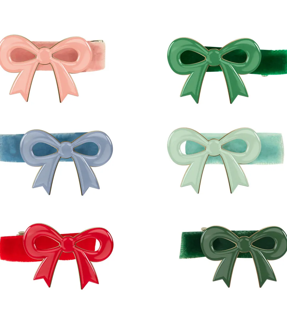 Meri Meri hårspænderne besår af krokodillenæb med velour på den ene side, og de er dekorerede med sløjfer af metal med farverigt emalje.