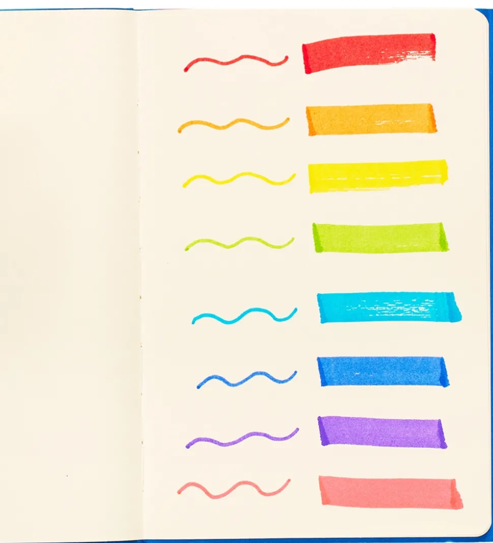 Gode Ooly tuscher med seks farver, som er rød, gul, blå, lilla, orange, grøn, navy og pink.