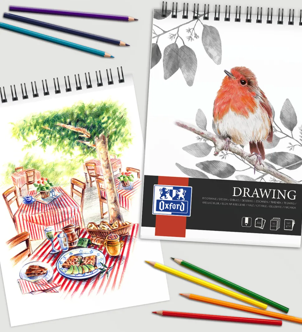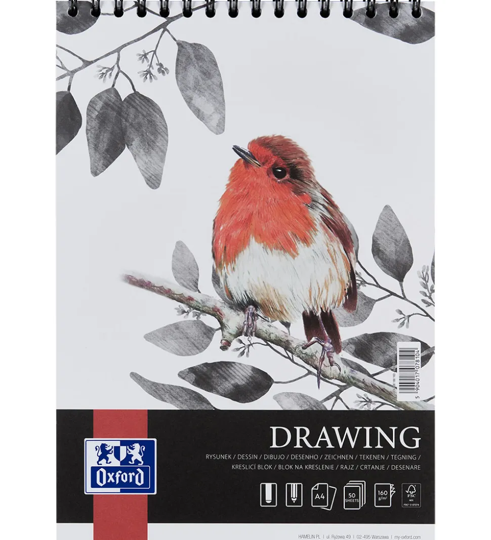 Oxford skitseblokken har spiralryg og den er perfekt til tegninger med blyant og farver. Papirets kvalitet er på 160 g/m2.