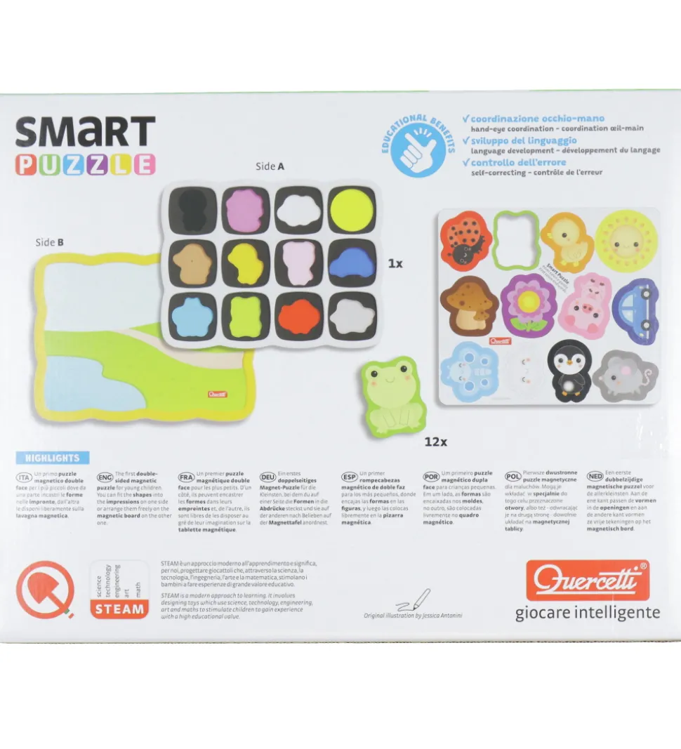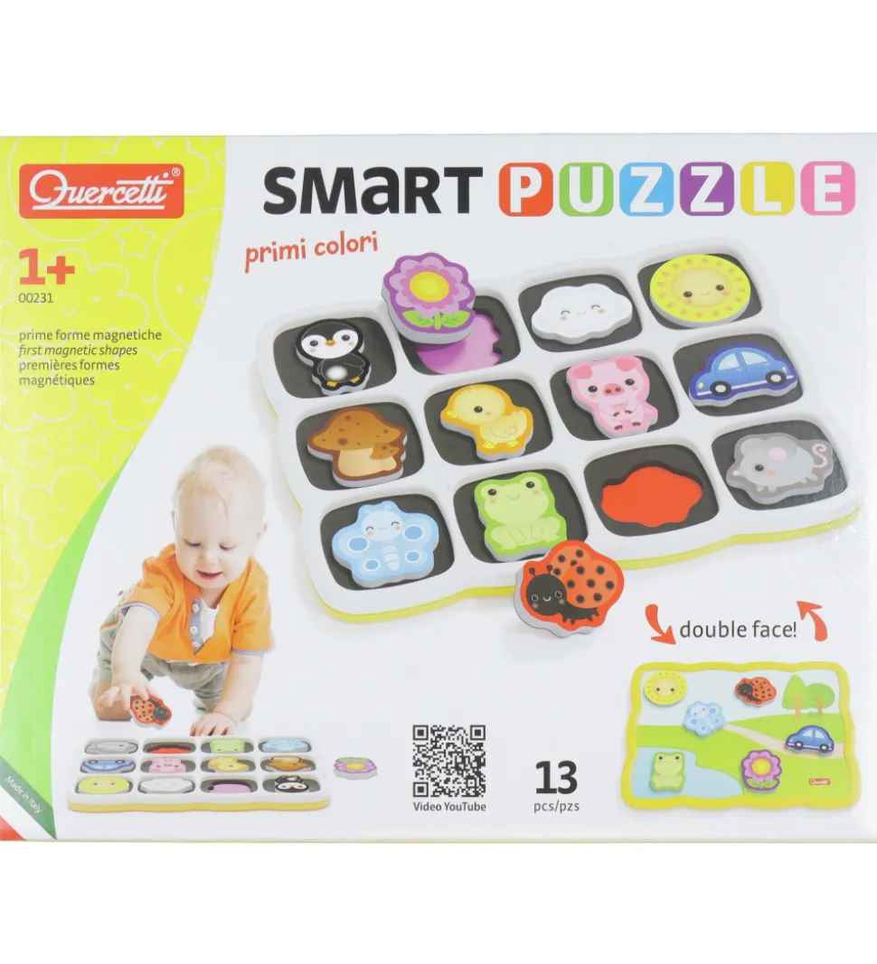 Skønt Quercetti puslespil med 12 magnetiske brikker i flotte farver og former. I æsken medfølger: