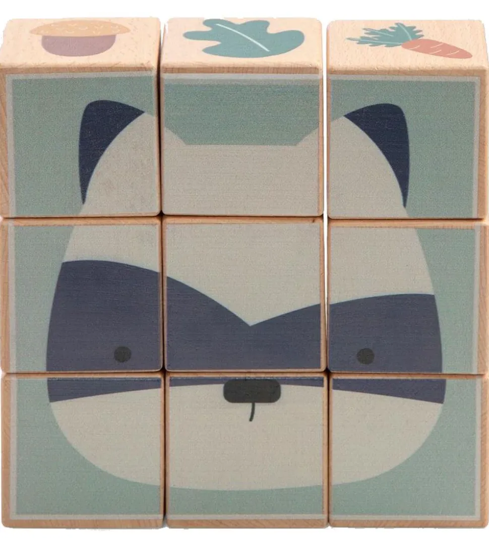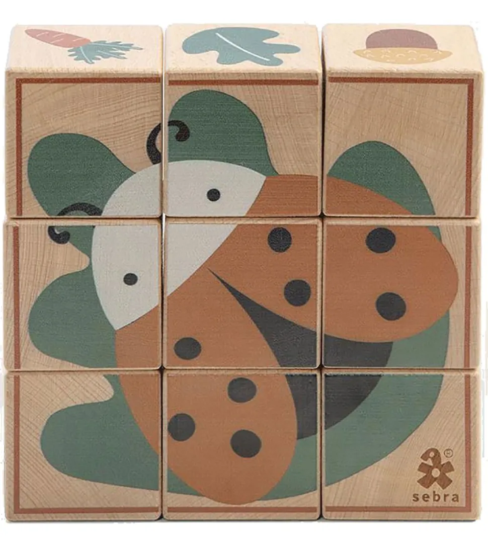 Sebra puslespillet består af 9 klodser, som har seks forskellige motiver på hver side. Klodserne kan danne to puslespil, viser tallene fra 1-9, dyr og grøntsager med mængden 1-9 på og forskellige motiver af dyr. Puslespillet kan derfor bruges til mange forskellige ting.