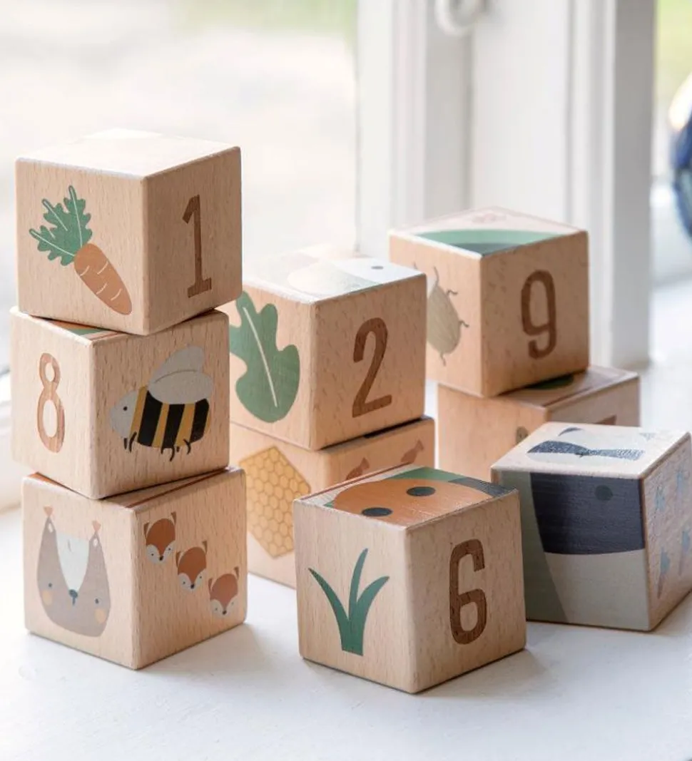 Skønt Sebra klodspuslespil med fine illustrationer af en mariehøne, en panda, tal og enkelte motiver.