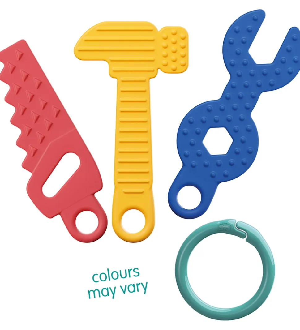 Farverigt SES Creative aktivitetslegetøj bestående af en skruenøgle, en hammer, en sav samt en ring til at samle værktøjet. SES Creative sikrer sjov sensorisk stimulation for de små med blødt materiale og klare farver.