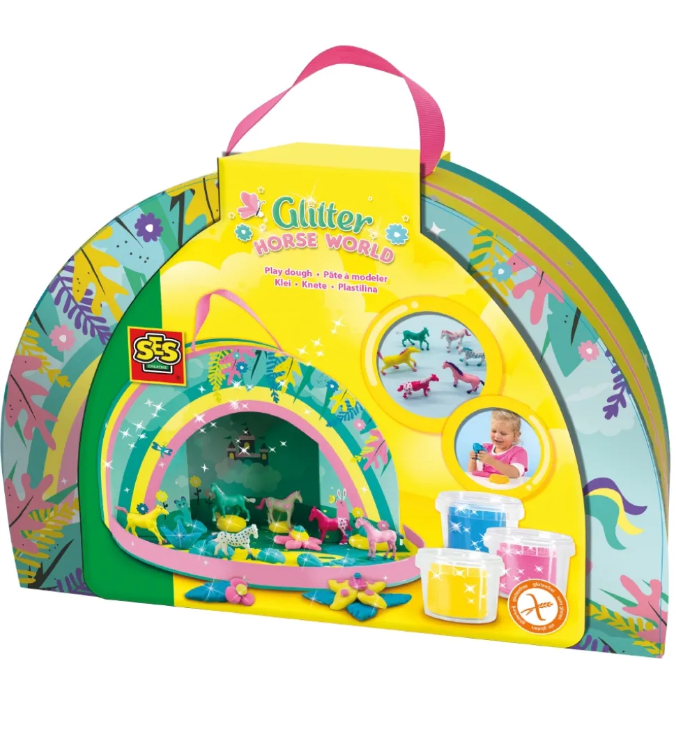 Æsken indeholder en legesæske, 6 heste og 3 bøtter glittermodellervoks.