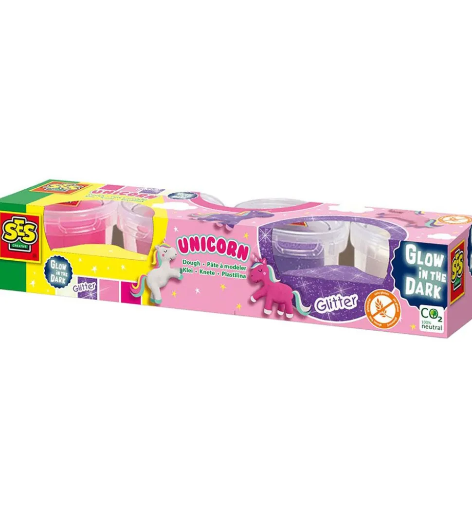 Sjovt SES Creative modellervoks i med fire bøtter i alt, hvor to er almindelige moderllervoks i pink og rosa. Den lilla har glimmer i sig, og den hvide er selvlysende i mørke.
