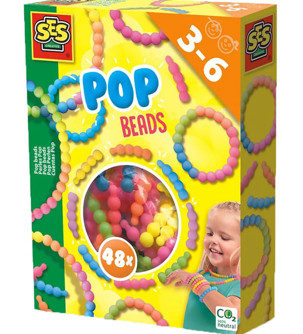 SES Creative popperlerne består af fire perler, med et hul i den ene ende og en stang i den anden, så de frit kan sættes sammen, f.eks. til et armbånd, en halskæde eller lignende.