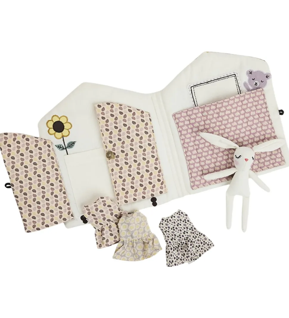 Smallstuff stofbogen åbnes og en fin kaninbamse titter frem og kan leges med i det lille rum, som har klædeskab og seng, der kan henholdsvis åbnes og puttes i. Derudover medfølger 3 outfits til kaninbamsen.