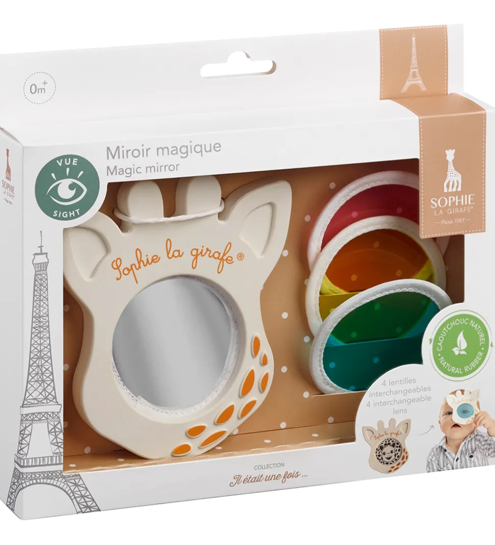 Sophie la Girafe aktivitetslegetøjet består af et spejl og 3 gennemsigtige linser i forskellige farver der kan skiftes ud i den søde girafholder. Barnet kan både bruge aktivitetslegetøj til at lege med i mange timer samt udvikle deres fin motorik og nysgerrighed
