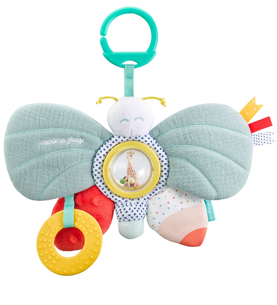 Sophie la Girafe aktivitetslegetøjet er lavet i en blød kvalitet. Der hænger en bidering fra den ene vinge, og en roterbar kugle med raslekugler og en giraf indeni. Barnet kan både bruge aktivitetslegetøj til at lege med i mange timer samt sove på ved at vende puden om, så den bløde side vender op.