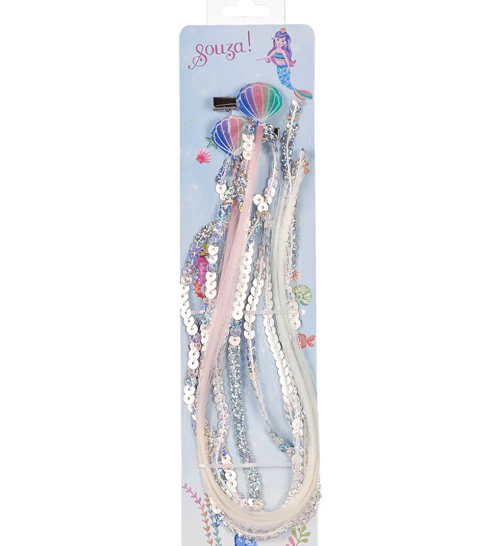 Souza hårklemmerne er lavet som farverige muslingeskaller og har glitrende pailletter og hår i en rosa nuance.