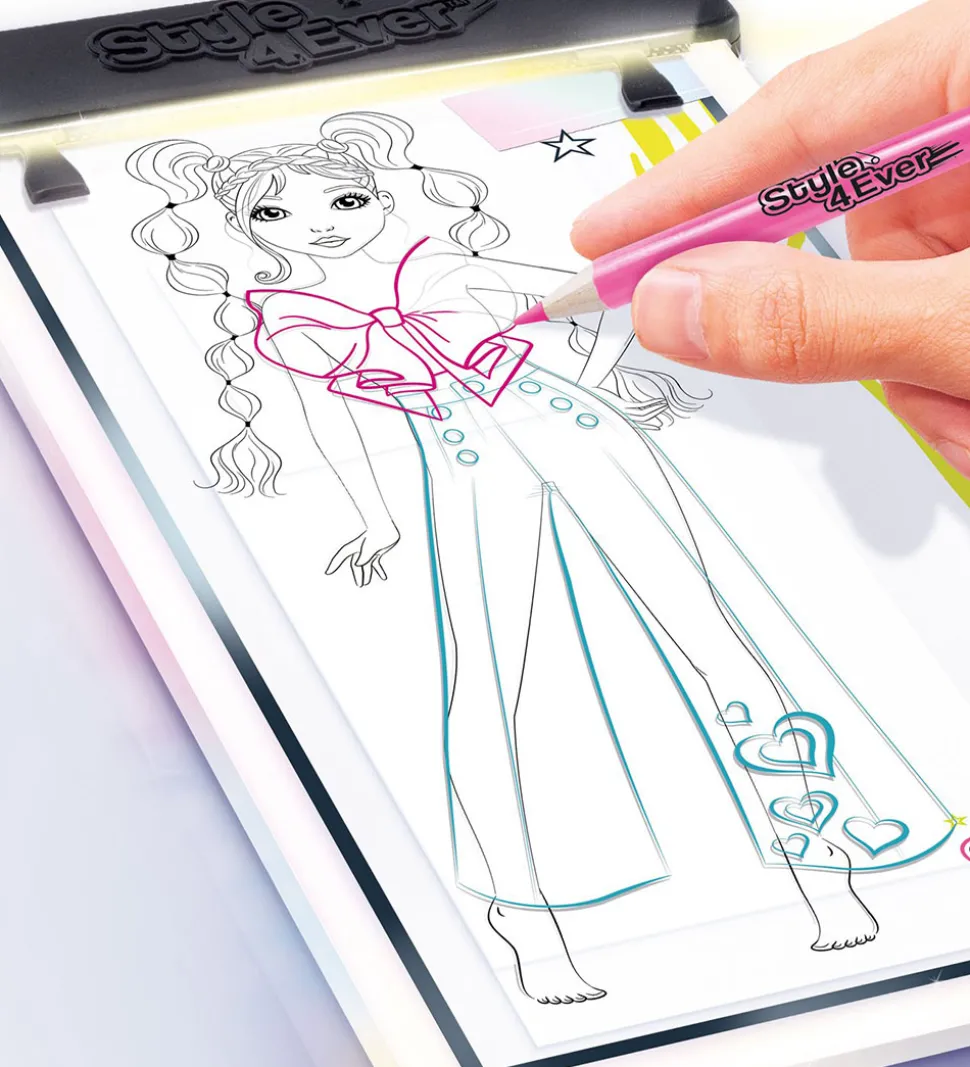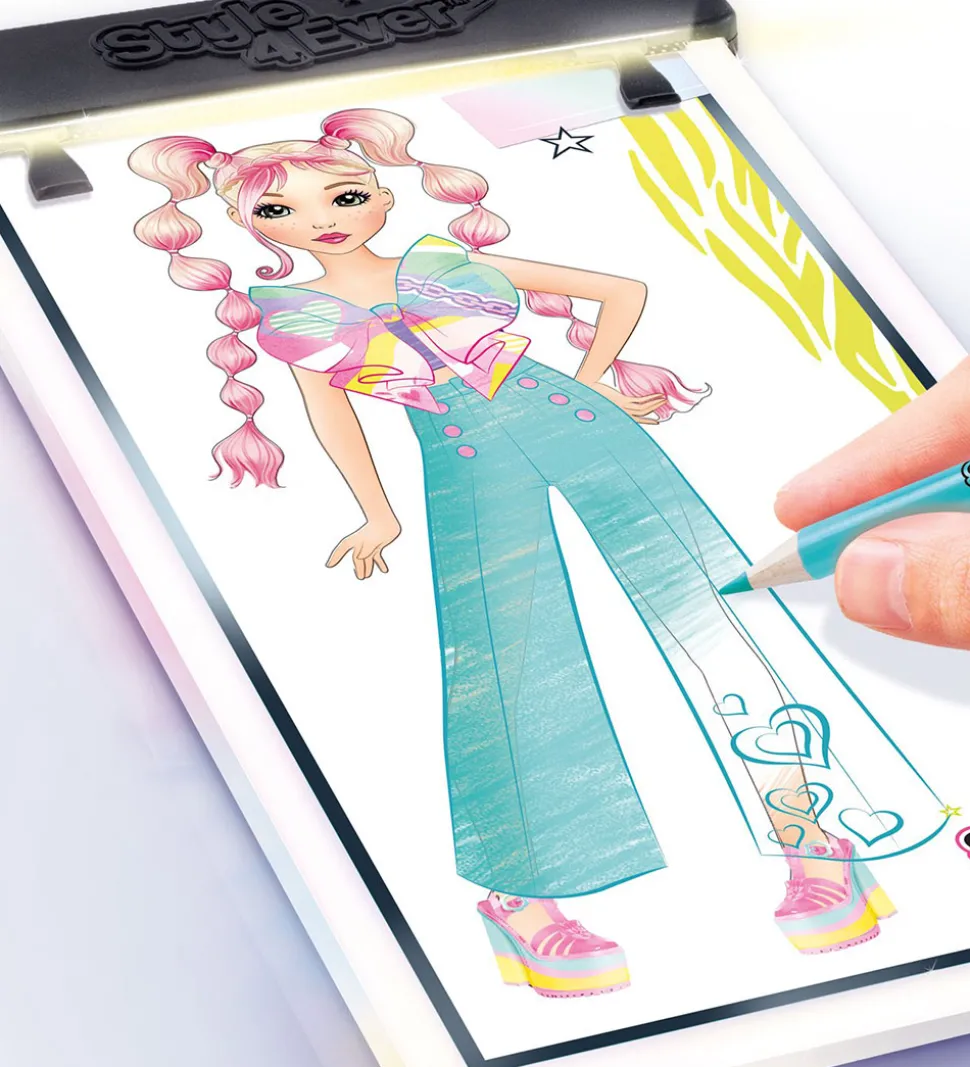 Style 4 Ever fashion designer kreasættet er perfekt til det kreative barn, som vil skabe deres egen designs og se de flotte resultater. Her er alt man skal bruge til at skabe det ønskede look. Udvælg den rette farve og skab dit eget design ved hjælp af skabelonerne, eller tegn dit eget.
