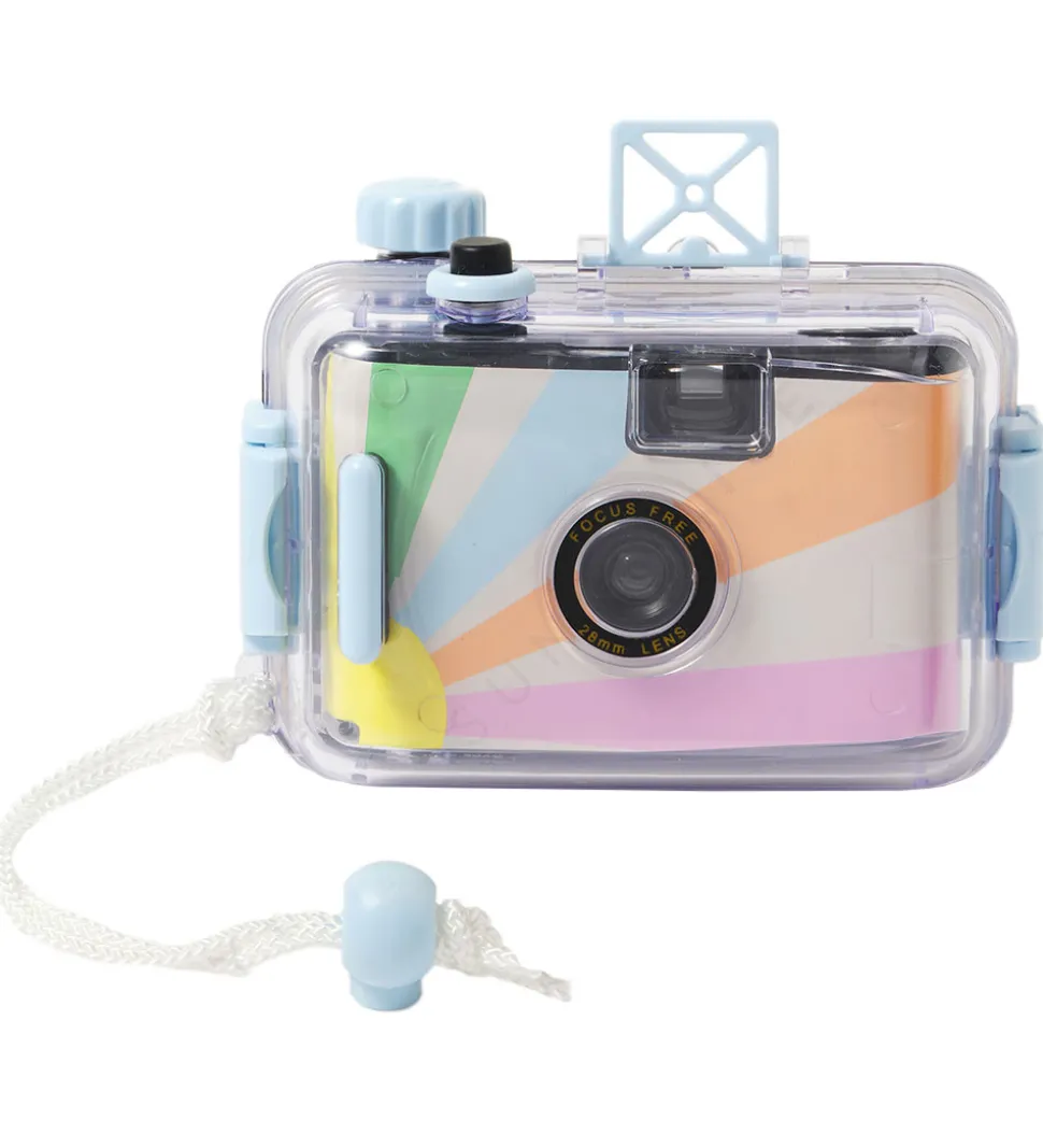 Sjovt SunnyLife undervandskamera med hvide, lyseblå, orange, rosa og grønne farver i et design med striber.