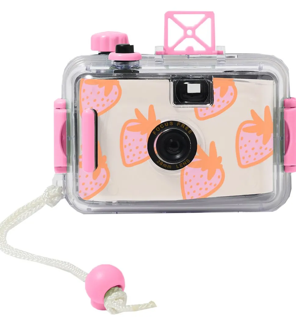 Sjovt SunnyLife undervandskamera i hvid, med print af jordbær i rosa og orange.