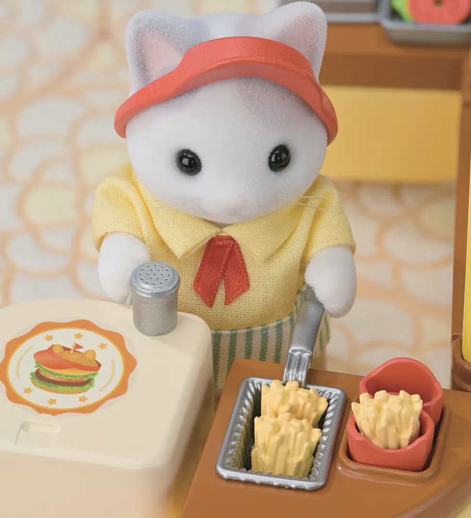 Flot Sylvanian Families legetøj i form af denne hamburger stand-sæt, hvor der medfølger en katte-figur med scooter og burgerformet stand samt masser af legemad og tilbehør.