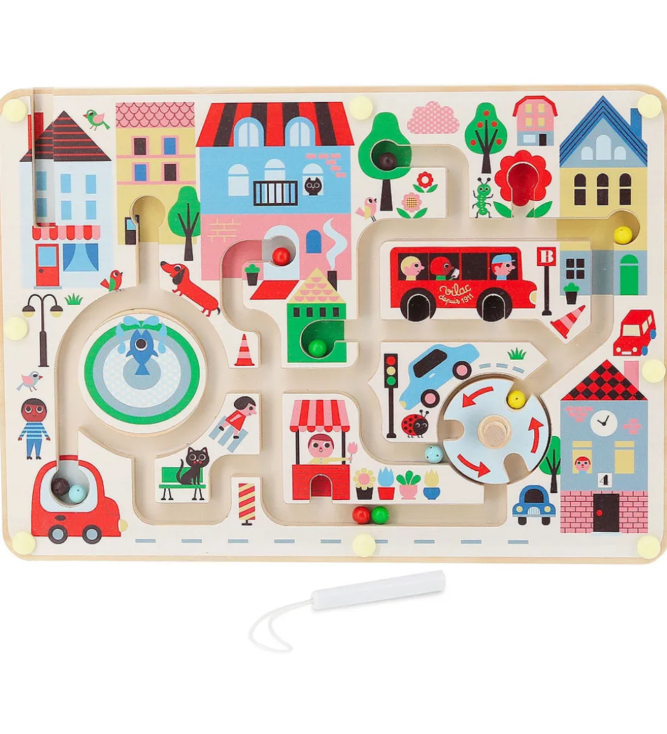 Vilac labyrinten har magnetiske dele og kugler, som med den magnetiske stav føres gennem den lille bys labyrint. Legetøjet er perfekt til de små, da det lærer dem basal problemløsning og kreativitet samt udvikler deres finmotorik.