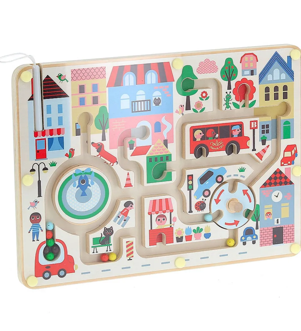 Sjov Vilac magnetisk labyrint i træ, som forestiller en lille by.