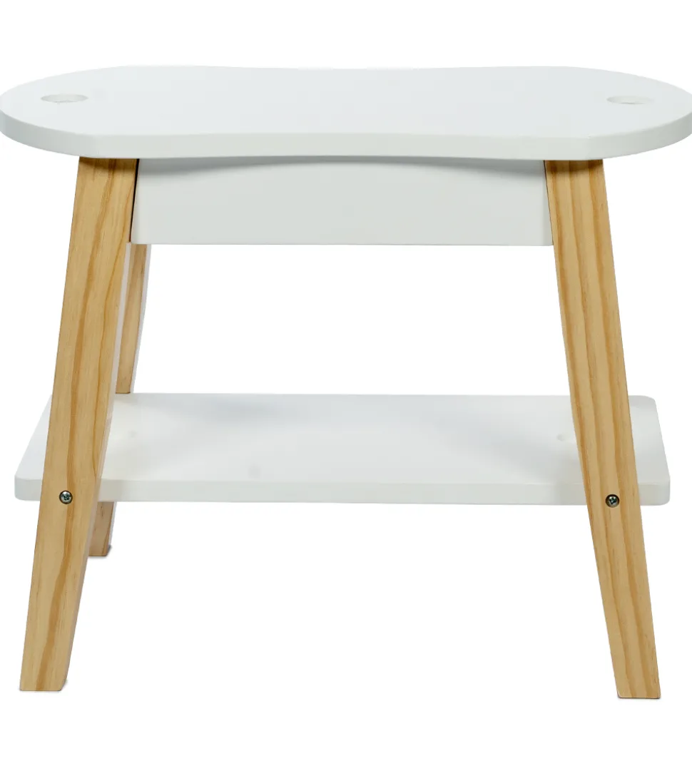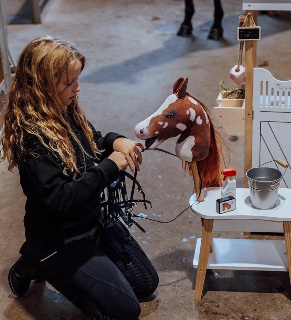 by Astrup styling skamlen har en oval bordplade med en hylde under, hvor man kan lægge det udstyr man skal bruge til at style sine kæpheste. Skamlen har et hul i hver side, hvor der er plads til to kæpheste, som barnet kan give fine frisurer.