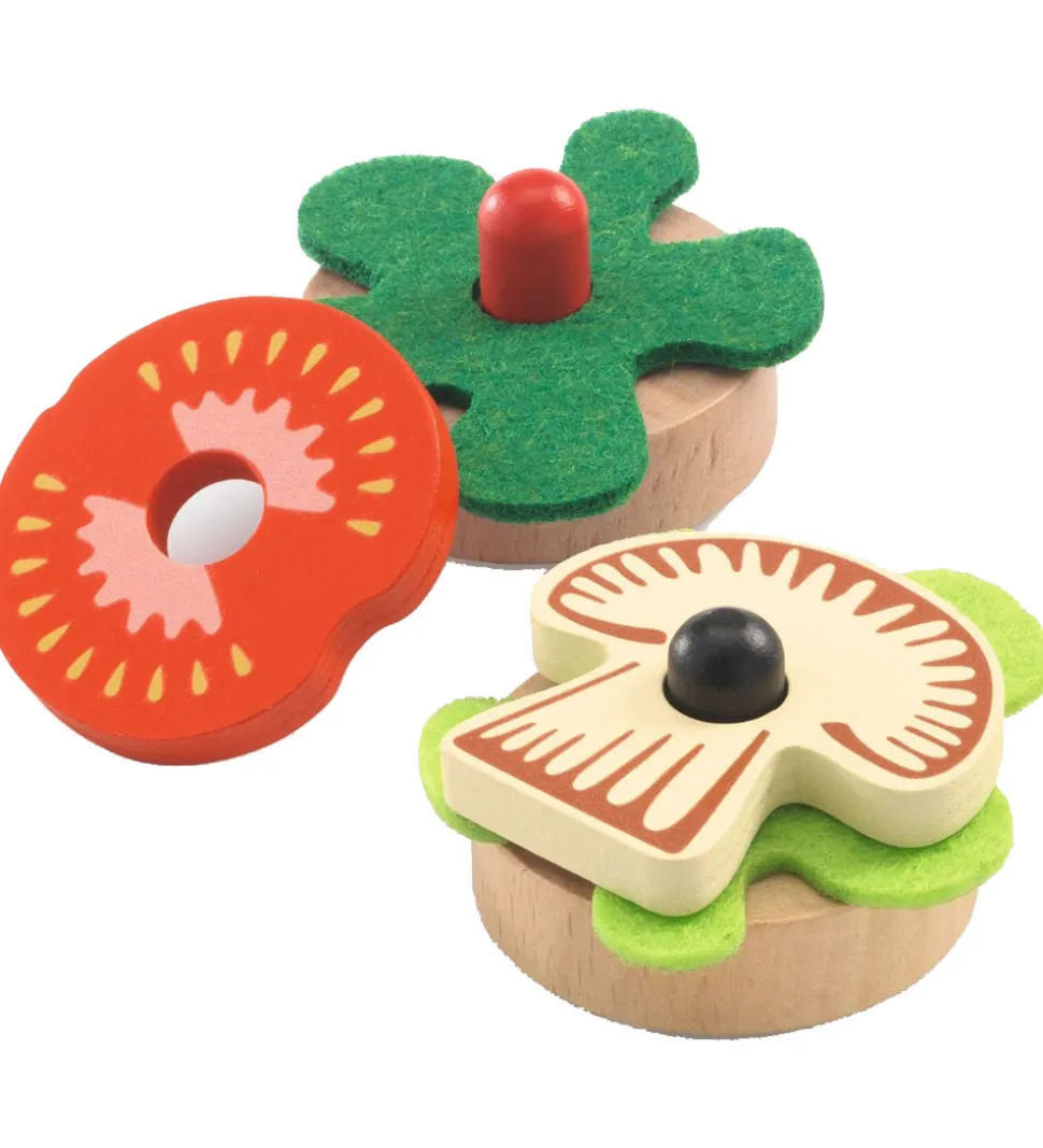Djeco legemaden består af en æske, med lækre madvare. Der medfølger glas, en skål og madvare så man kan bygge sine egne sandwiches.