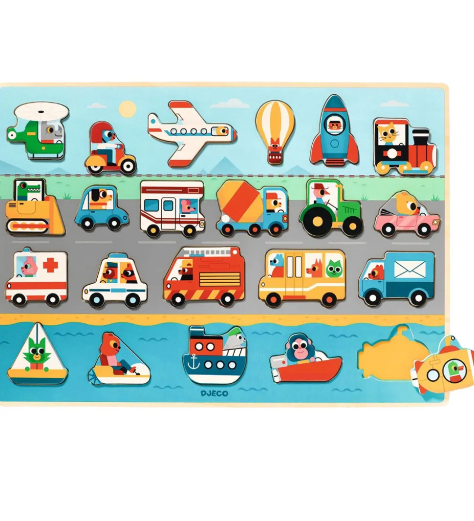 Sjovt Djeco puslepil af træ, med motiver af forskellige både, biler og flyvemaskiner.