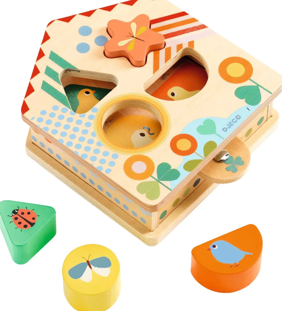 Djeco puttekassen har afrundede hjørner, med fire huller i toppen i forskellige former. Hullerne har hver sin udformning – trekant, cirkel, stjerne og halvcirkel – og der er matchende klodser i flotte farver. I bunden er et håndtag til at trække en plade ud, så brukkerne forsvinder den i hullerne.