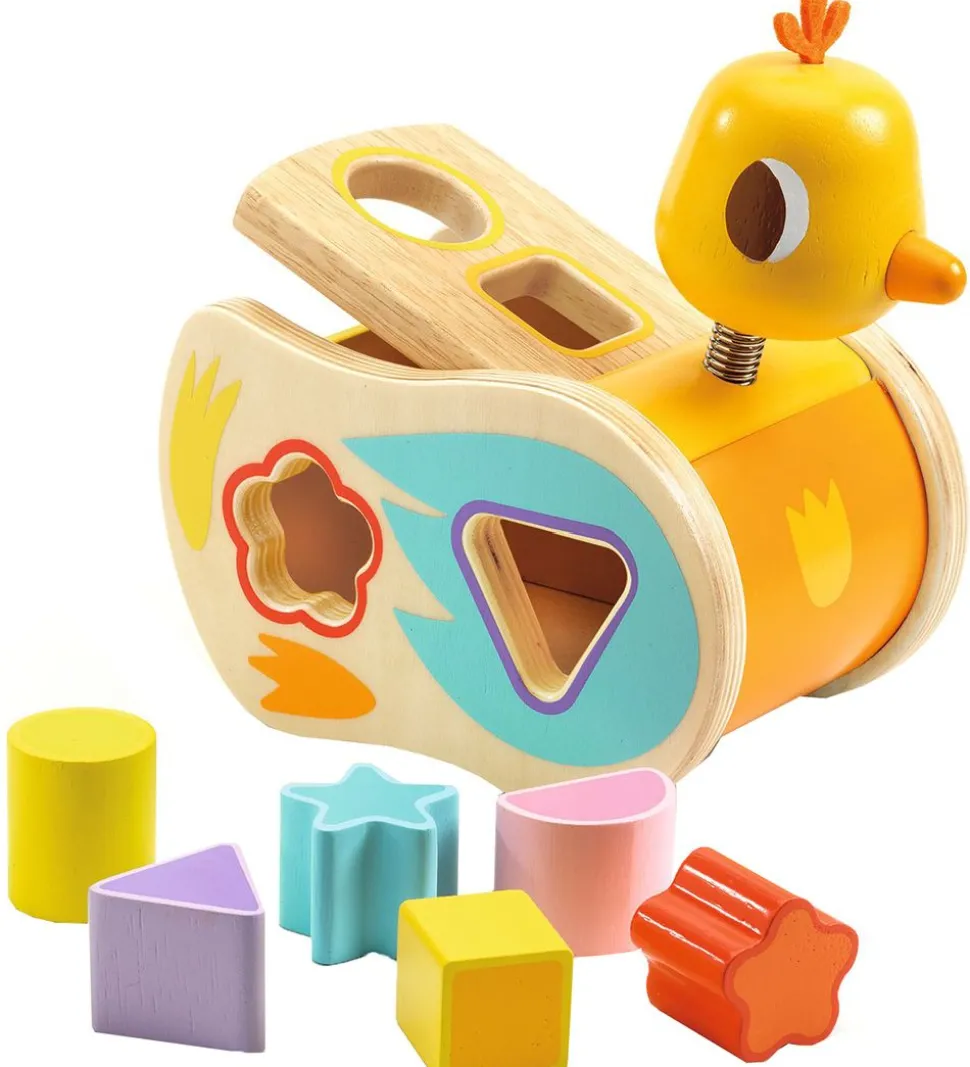 Djeco puttekassen har 6 huller, hvor hvert hul har hver sin udformning – trekant, cirkel, stjerne, firkant, halvcirkel og blomst – og der en klods til hvert hul. Man kan løfte andens ryg, for at få adgang til klodserne.
