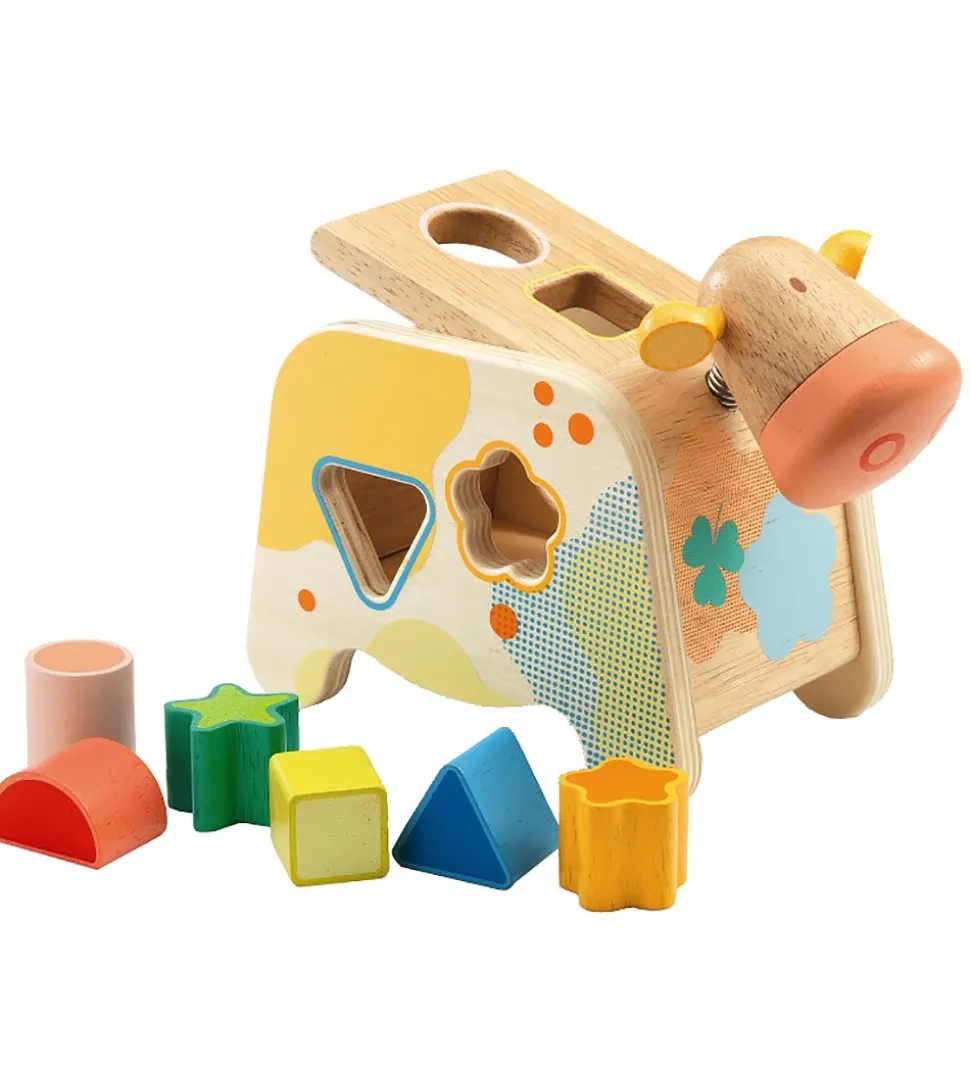 Sød Djeco puttekasse af træ, der er formet som en ko.