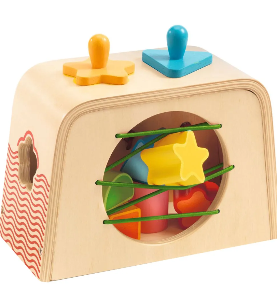 Djeco puttekassen har en firkantet form med afrundede hjørner, med to huller i toppen, et hul i den ene ende og to på fronten, som åbnes med en lille klap. Hullerne har hver sin udformning – trekant, cirkel, stjerne, halvcirkel og firkant – og der en matchende klods. På bagsiden er der et stort hul, med elastikker henover, så det er nemt at få klodserne ud igen.