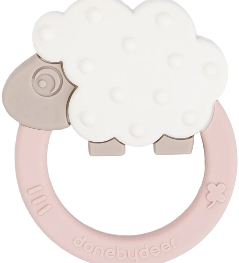 Done by Deer bideringen er lavet af silikone, hvor ringen er lavet af hård silikone mens fåret er lavet af blødt silikone. Bideringen har forskellige former og teksturer som er gode for gummer og tænder, mens ringen gør det nemt for barnet at holde fast i.