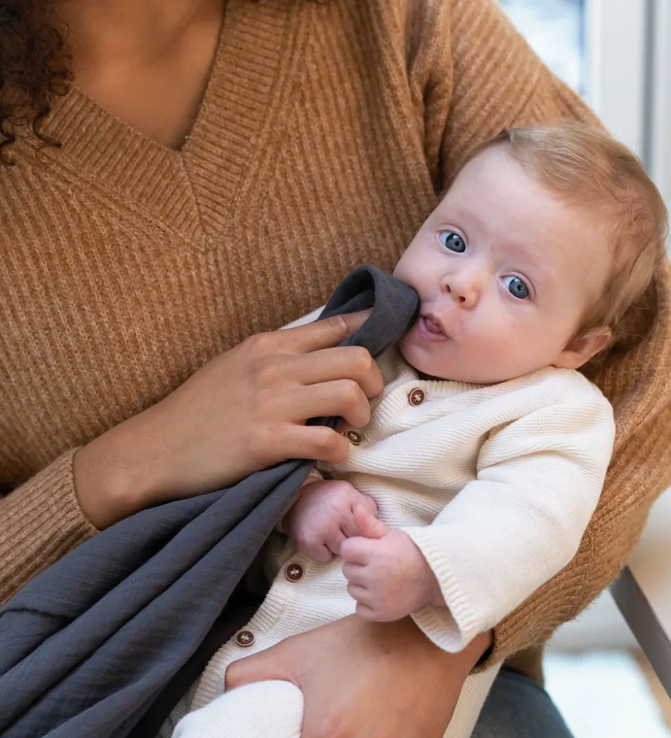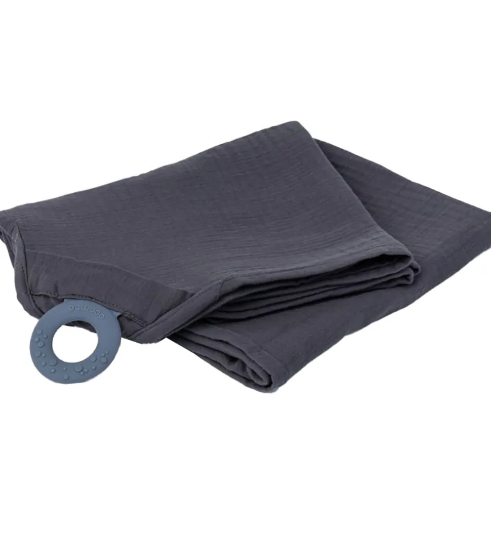 Doomoo ammetæppet er perfekt til at skabe et trygt og afskærmet rum under amning, og i det ene hjørne er fastgjort en silikone-bidering i en støvet, grå nuance.
