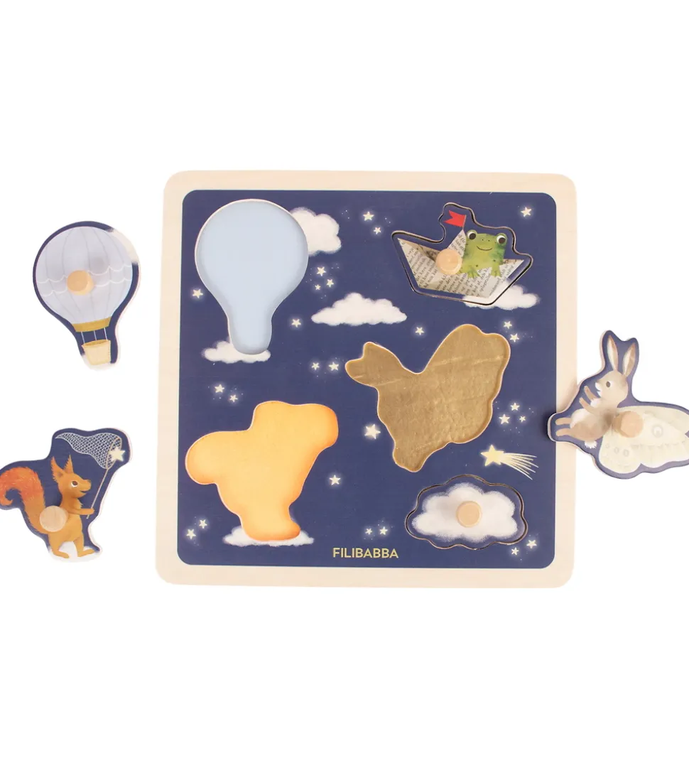 Hyggeligt Filibabba puslespil i mørkeblå med eventyrlige dyremotiver. Puslespillet er lavet af træ med 5 brikker og en knop på hver brik, så de er lette af rykke rundt. Bag hver brik er der stof, som matcher brikkens motiv, og som er sanselig at røre ved.