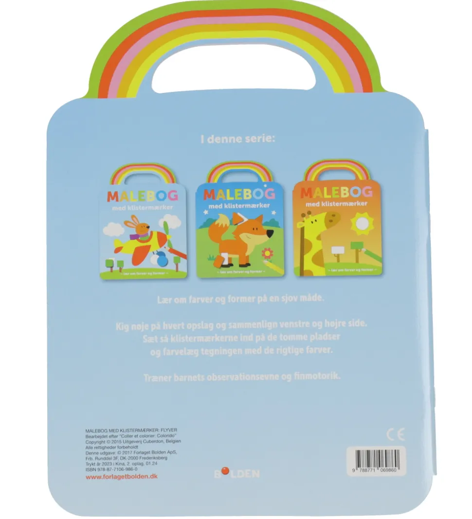 Sjov Forlaget Bolden malebog Malebog med klistermærker: Flyver. Malebogen er lavet med et regnbue-håndtag øverst.