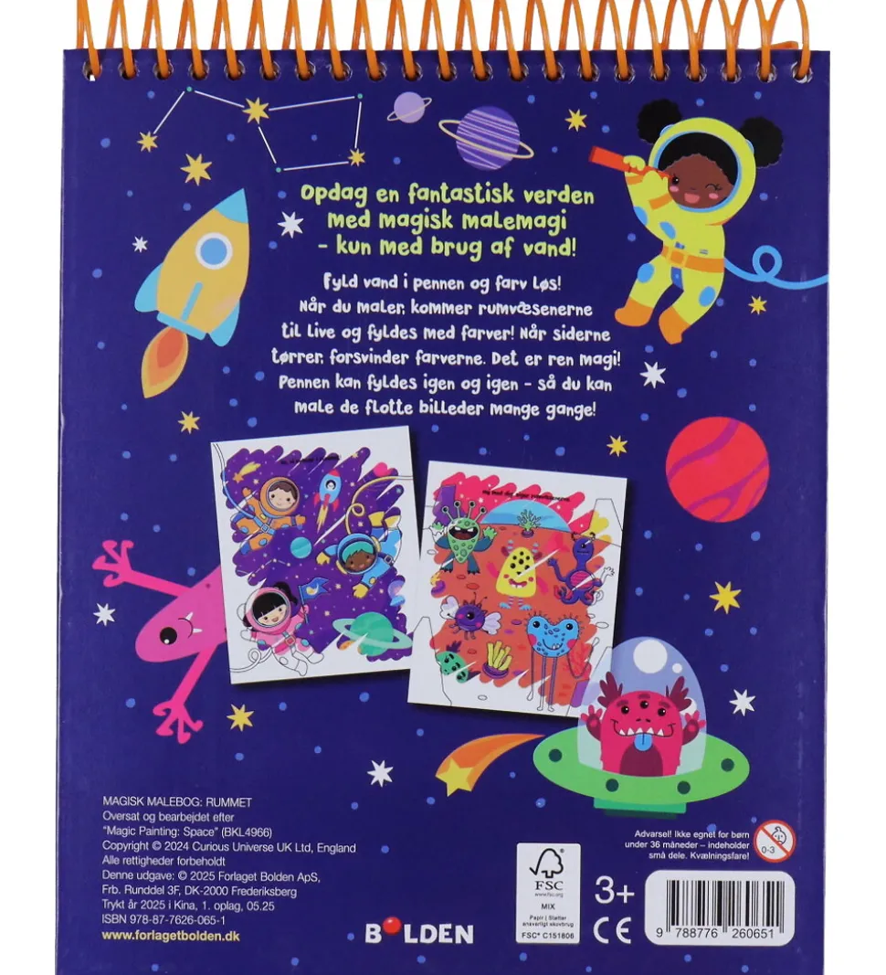 Forlaget Bolden malebogen inkluderer en vandpen, der får farverne til at komme frem. Når siderne tørrer forsvinder farven, og man kan derfor starte forfra og male billederne igen og igen.