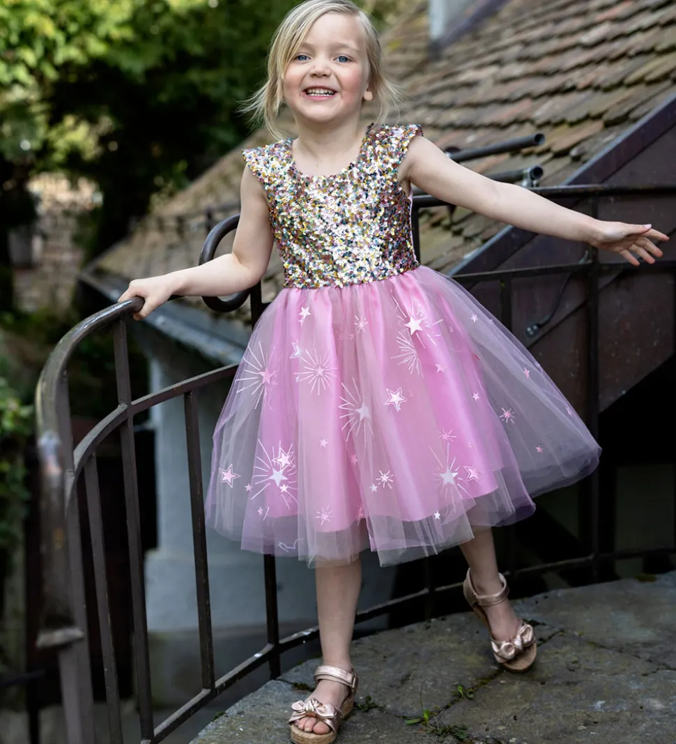 Flot Great Pretenders udklædning i form af en kjole med rosa tylskørt med glitrende stjerner og en overdel med farverige pailletter på fronten.