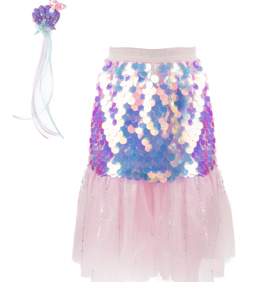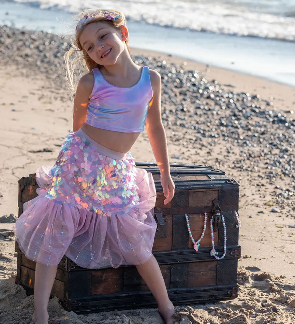 Farverig Great Pretenders udklædning bestående af en glitrende nederdel med flotte palietter i nuancer af lilla og en let pink underdel af tyl. Sættet inkluderer en matchende hår clips, der fuldender looket.