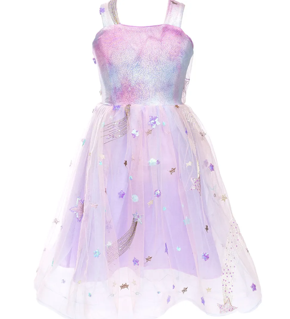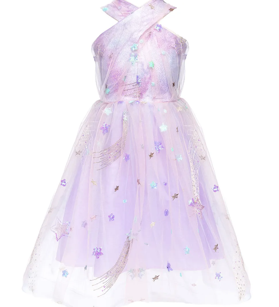 Smuk Great Pretenders udklædning, som forestiller en Taylor Swifts ERAS kjole. Udklædningen består af en kjole i lyslilla med flot, lyslilla tyl samt fine pailletter og broderingsmønstre.