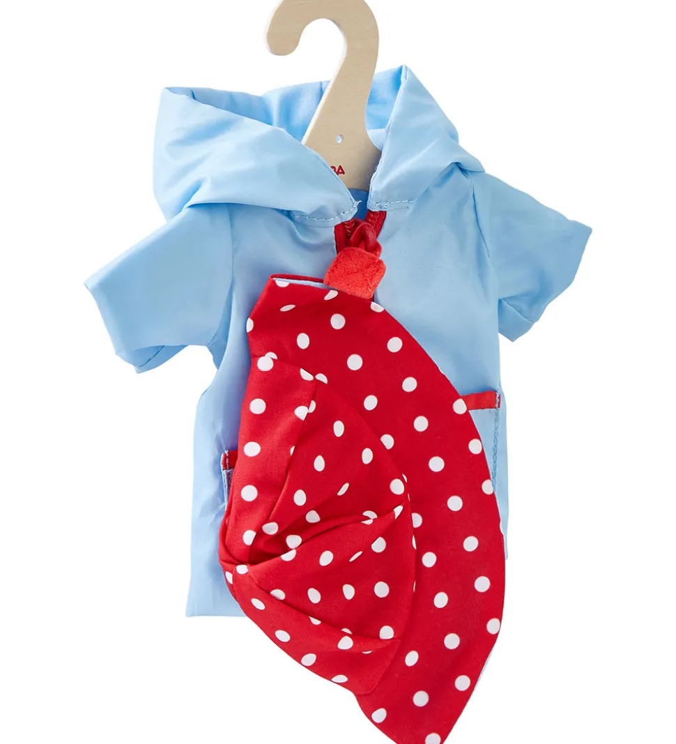 Charmerende HABA dukketøj bestående af en lyseblå regnfrakke, regnhat og sko i rød med hvide prikker. Kombinationen giver et sødt udtryk, der passer perfekt til dukkens garderobe. HABA sikrer kvalitet og stil.