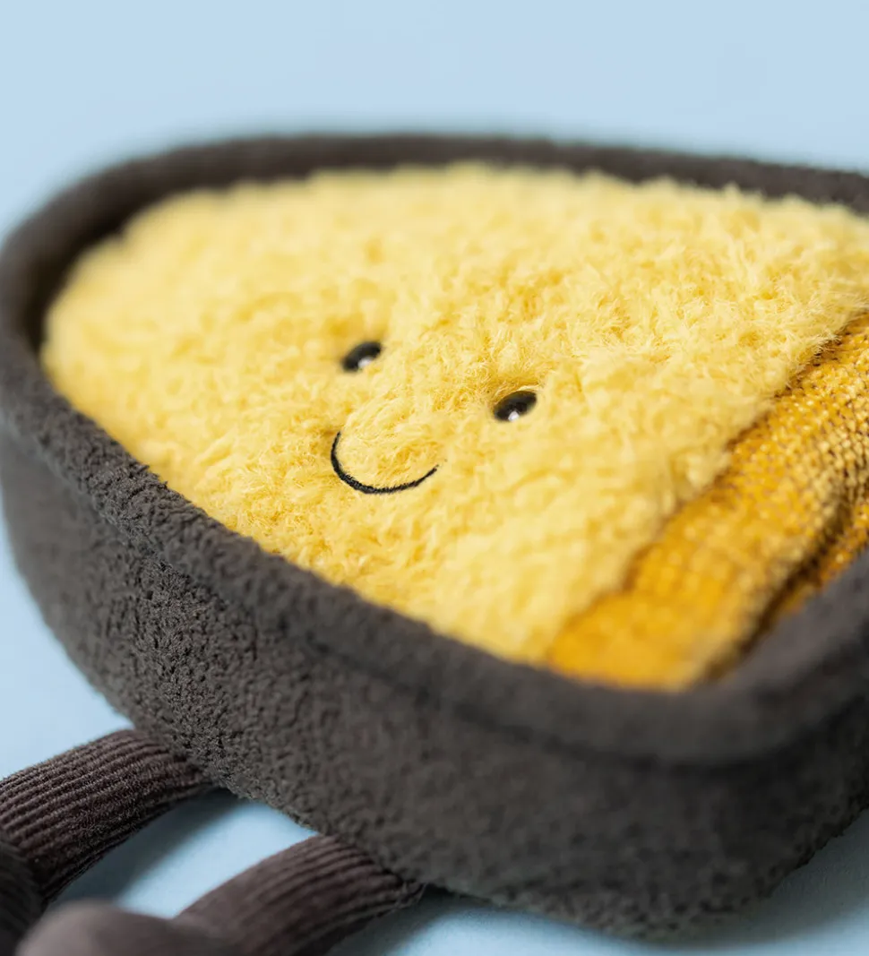 Sjov Jellycat bamse formet som en raclette i sort og gult plys med et broderet ansigt og små fødder.