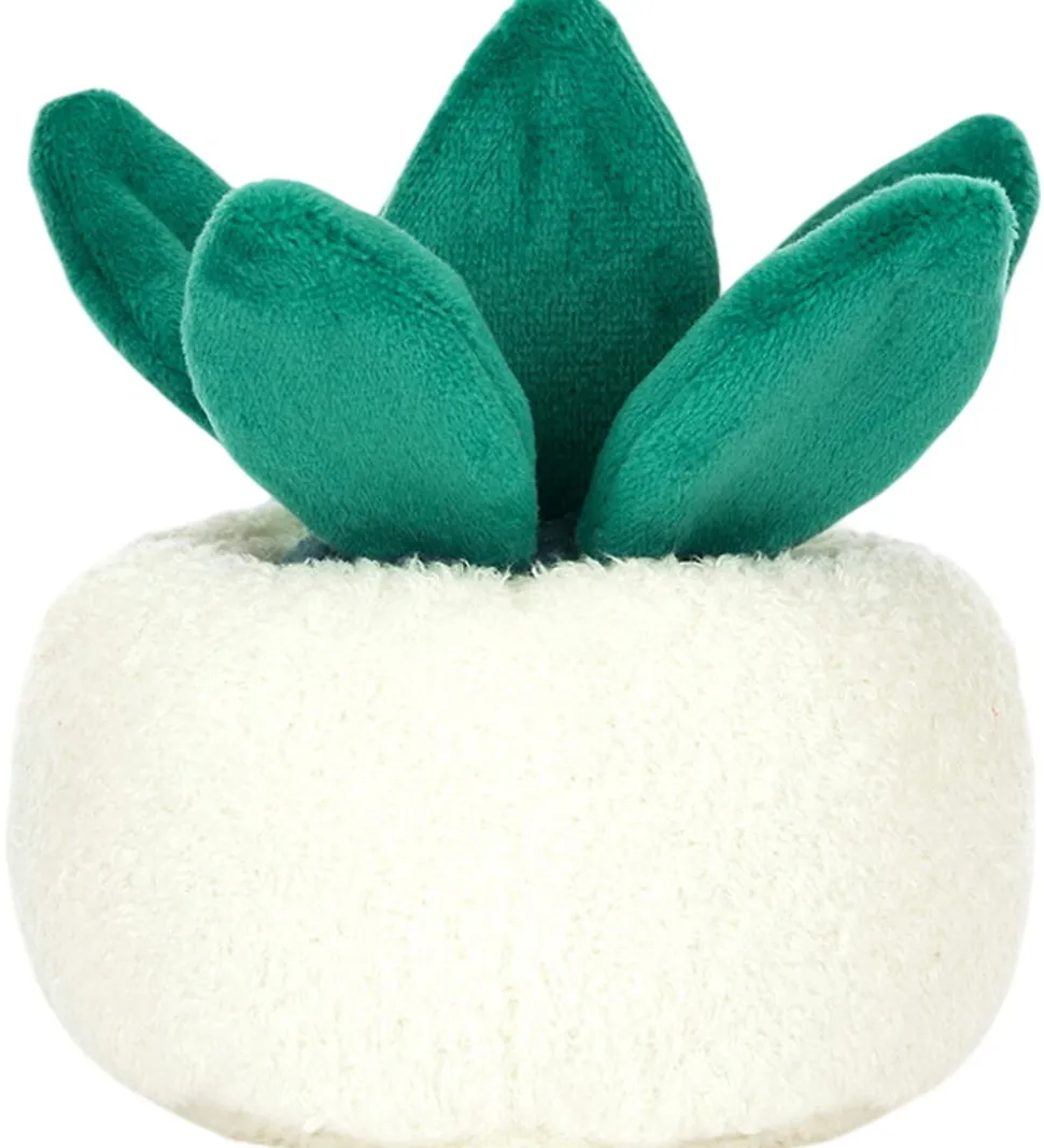 uhyggelig Jellycat bamse formet som en plantekrukke med et kraniedesign i blødt plys.