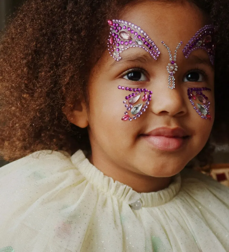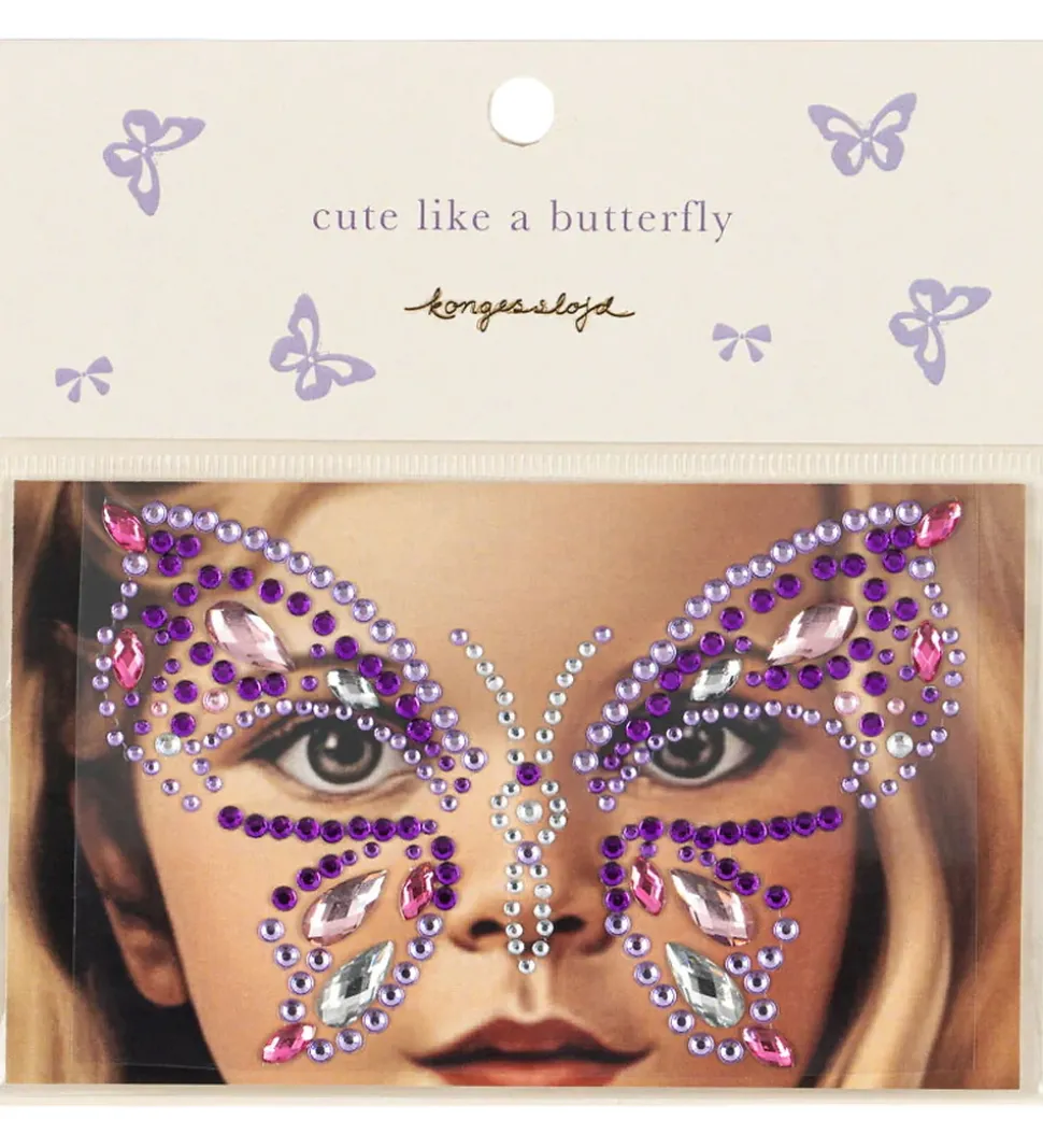 Fine Konges Sløjd ansigtssmykker med små plastikjuveler i skinnende lilla og rosa farver, som kan danne en sommerfugl.