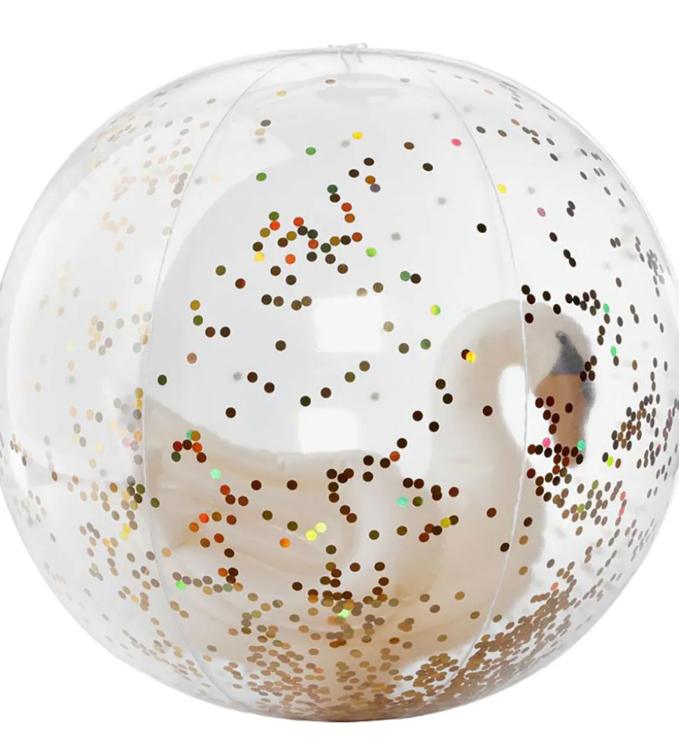 Sjov Konges Sløjd badebold i transparent med en hvid svane og konfetti indeni. Badebolden er god til vandleg og hygge på stranden eller ved poolen.