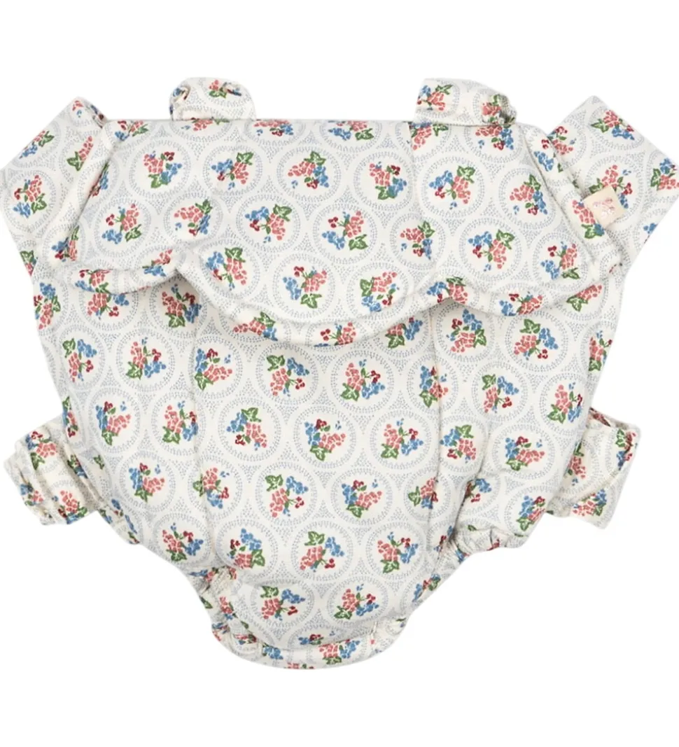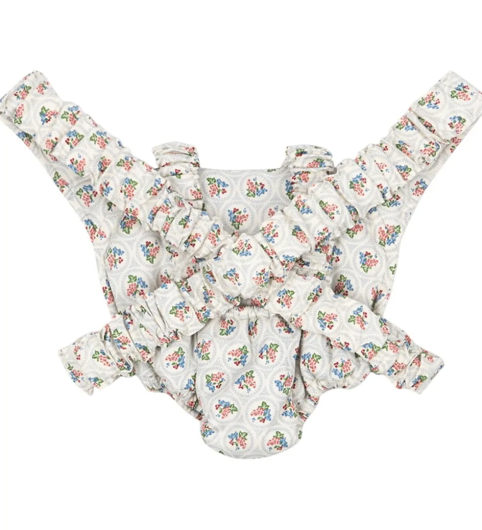 Fin Konges Sløjd dukkebæresele i hvid med et blåt, fint mønster og blomster i grøn, rosa, rød og blå. Bæreselen har praktiske stropper, der gør det let at håndtere. Dukkebæreselen tilføjer charme til legestunden, og inspirerer til kreativ leg.