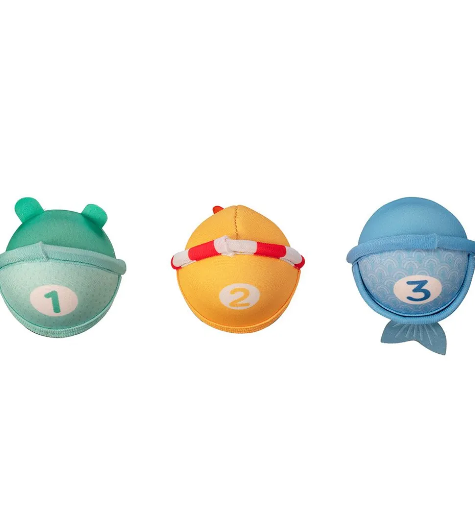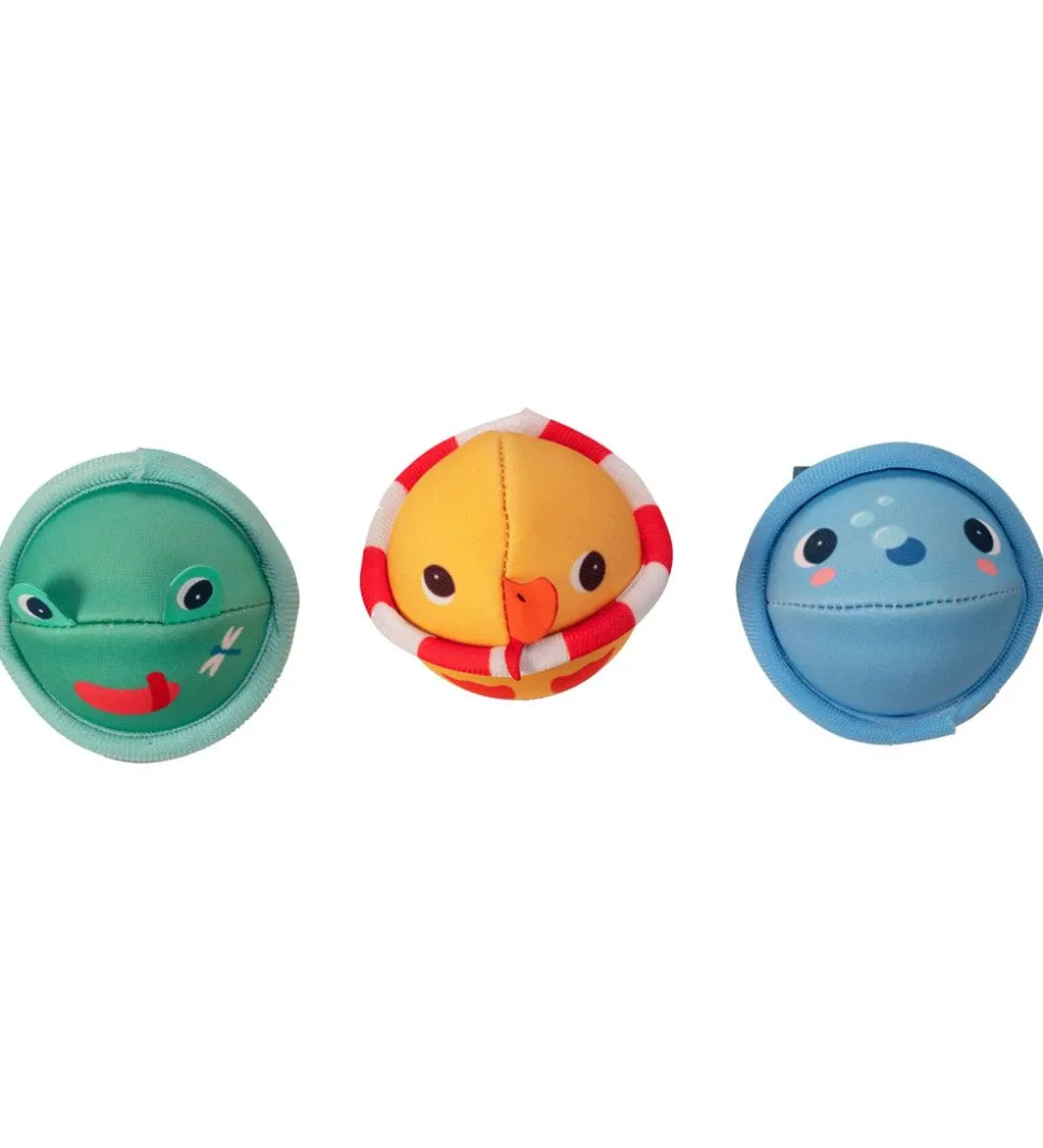 Sjovt Lilliputiens badelegetøj bestående af en kurv og tre bolde som ligner en and, en frø og en hval.
