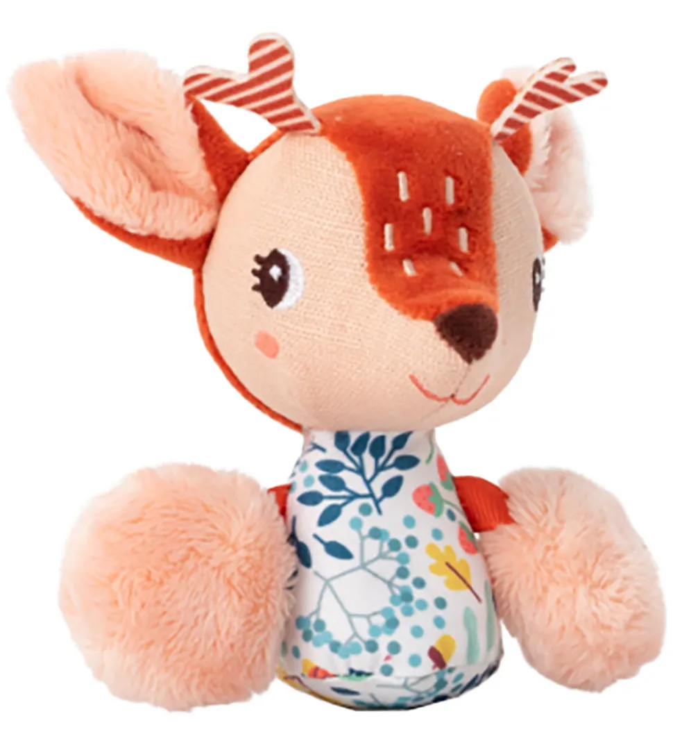 Sød Lilliputiens rangle med hjorten Stella i rødbrune og rosa farver samt en blomstret krop